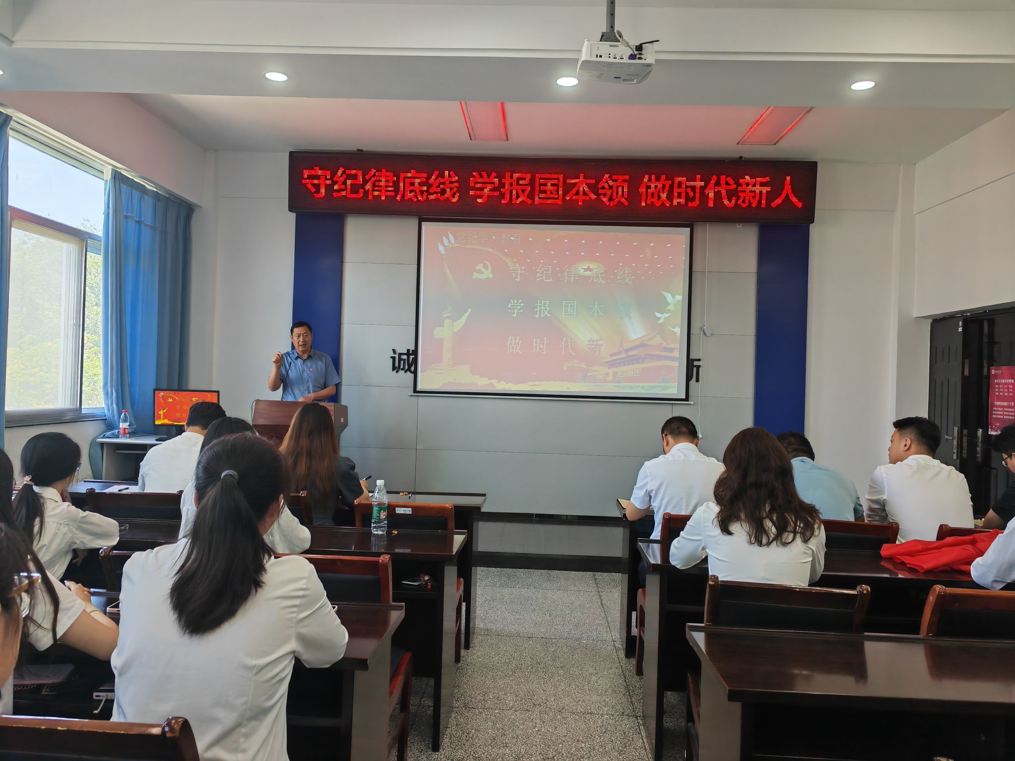 在嘹亮的齐唱国歌声中,大会开始。首先由陈晓华老师向毕业生党员做了安全文明离校教育及党团组织关系转接工作辅导。万金店以“守纪律底线、学报国本领、做时代新人”为主题,为全体毕业生党员讲授党纪学习教育专题党课。他首先强调了对毕业生党员进行党纪学习教育的必要性及重要意义,结合教育领域的真实案例及自己学习工作中的切身体会,谆谆教导与会党员要学纪、知纪、明纪、守纪,自觉用党规党纪校正思想和行动,始终牢记党员身份,刻苦学习专业技能本领,提升工作能力,坚定信念、胸怀祖国、脚踏实地、担当作为。
