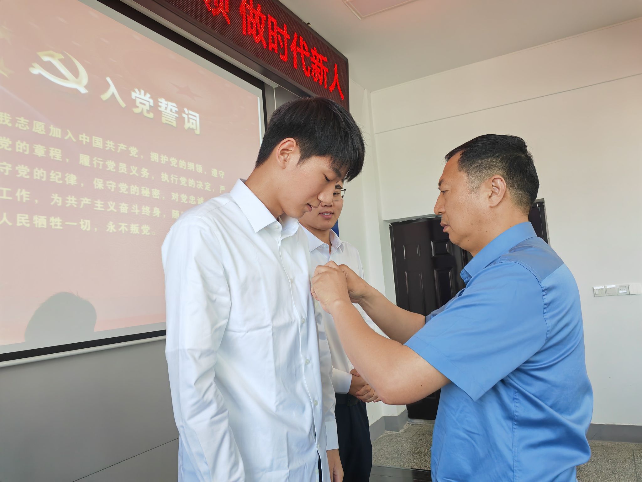 党课结束后,大会进行了“佩戴党员徽章、重温入党誓词”仪式。万金店为党员代表佩戴党员徽章,毕业生党员们互相佩戴党员徽章,亮明党员身份。研究生党员代表秦晨晨带领在场全体党员面向党旗,重温入党誓词,仪式庄重而坚定。