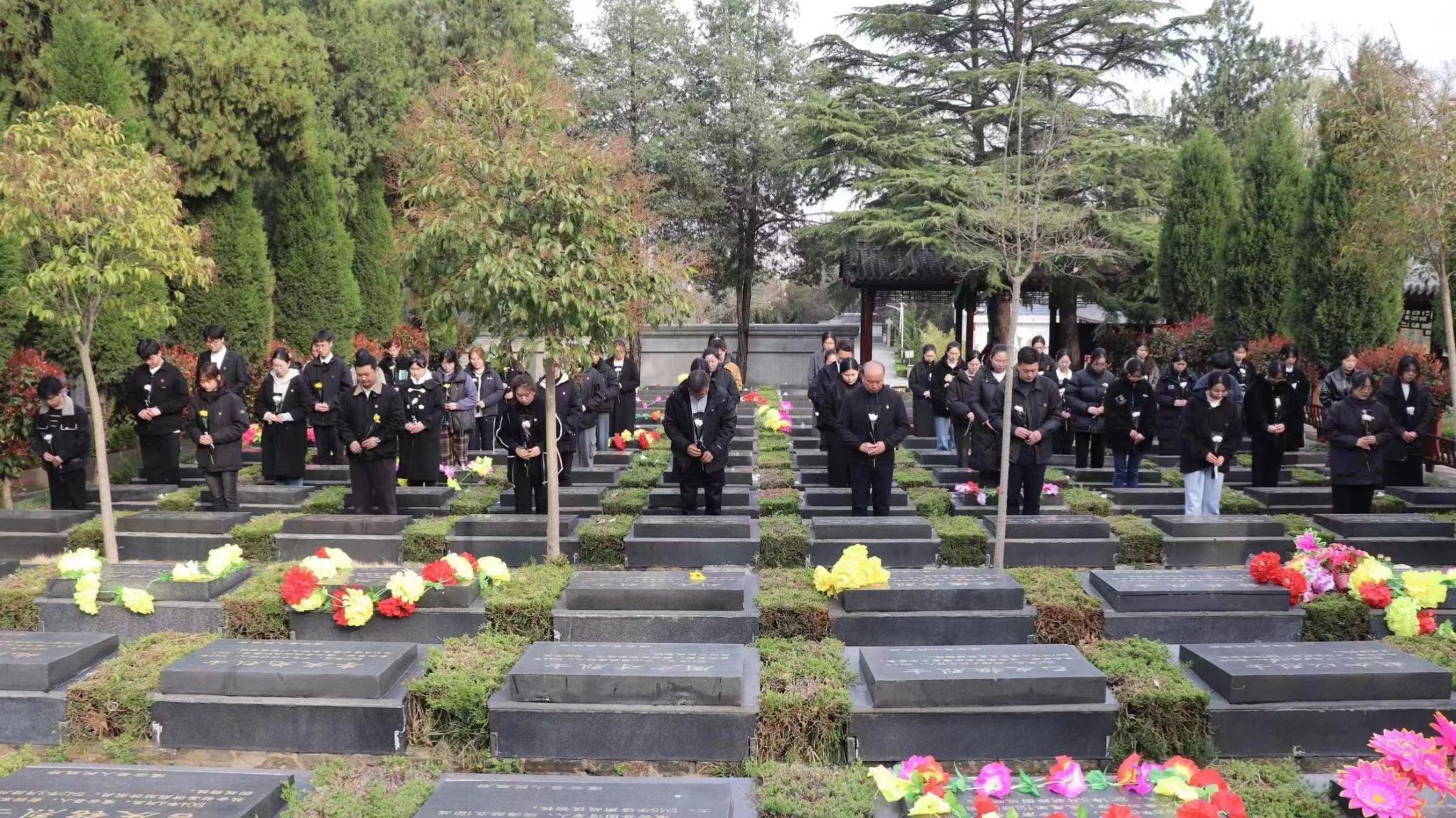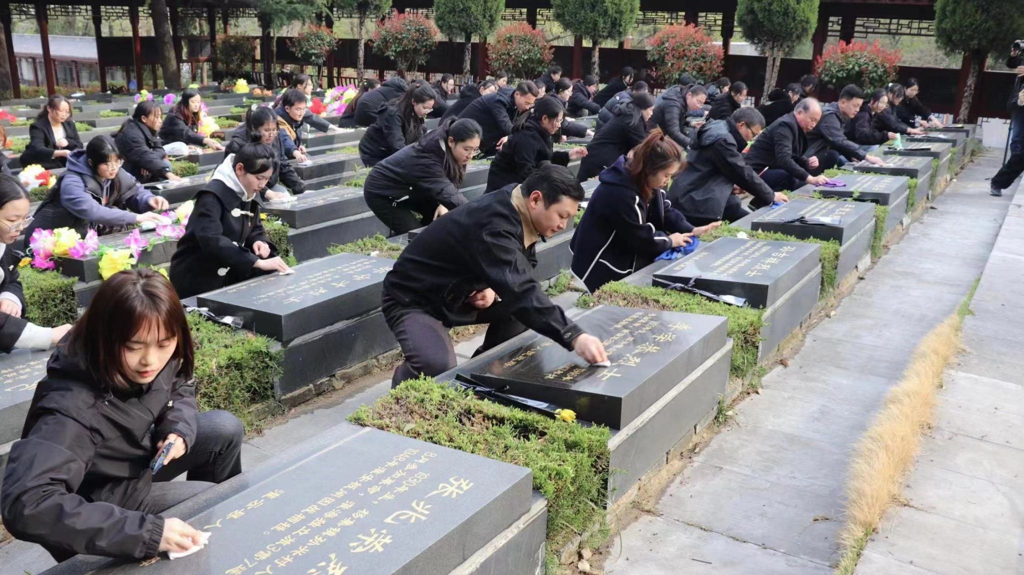 活动进入最后阶段,全体人员移步至烈士墓园。大家在行礼默哀后擦拭墓碑,并献上鲜花,依次排队为墓碑描红,表达对烈士们的敬仰与怀念。每支鲜花、每支毛笔都寄托着对烈士的深深哀思和崇高敬意。最后员工们还自发地清扫杂草等,以实际行动维护烈士陵园的整洁与庄严。