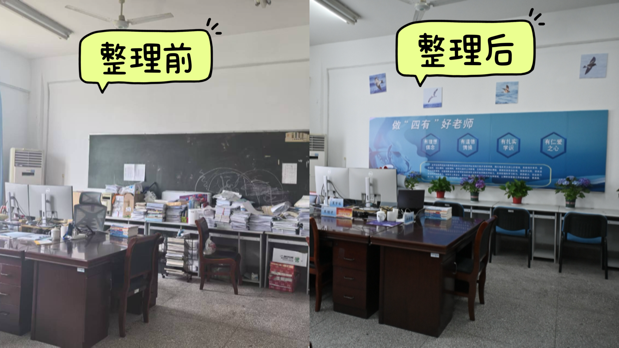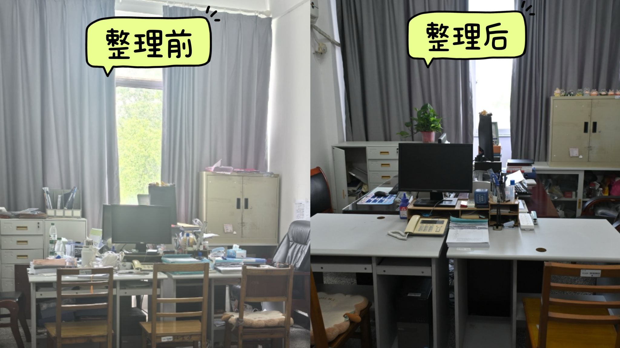 •物品整理,传递管理理念:对办公桌上的文件、资料、办公用品等进行整理和归类,合理摆放,做到整齐有序。这不仅提升了办公效率,更向师生传递了科学管理、高效执行的理念。