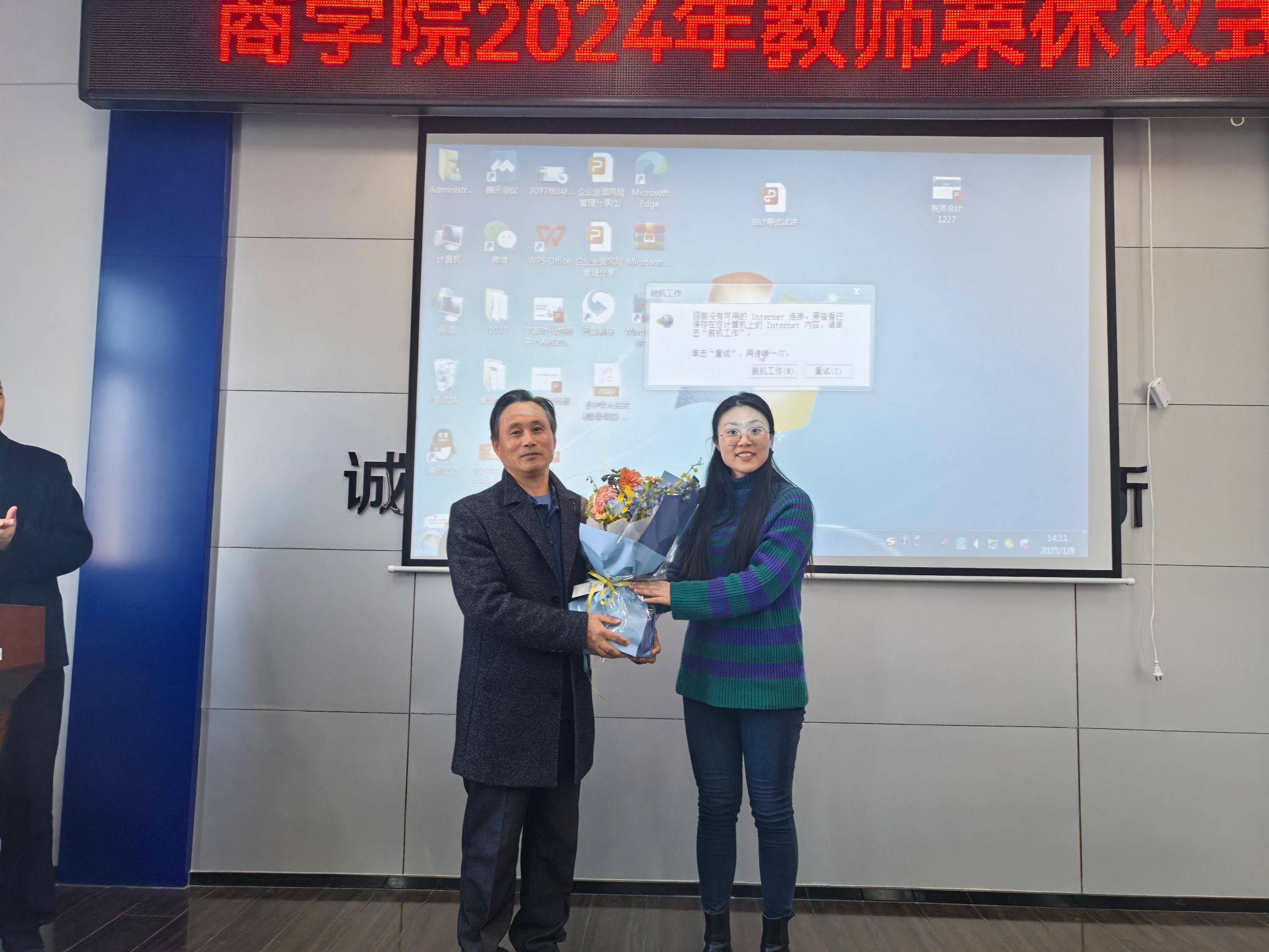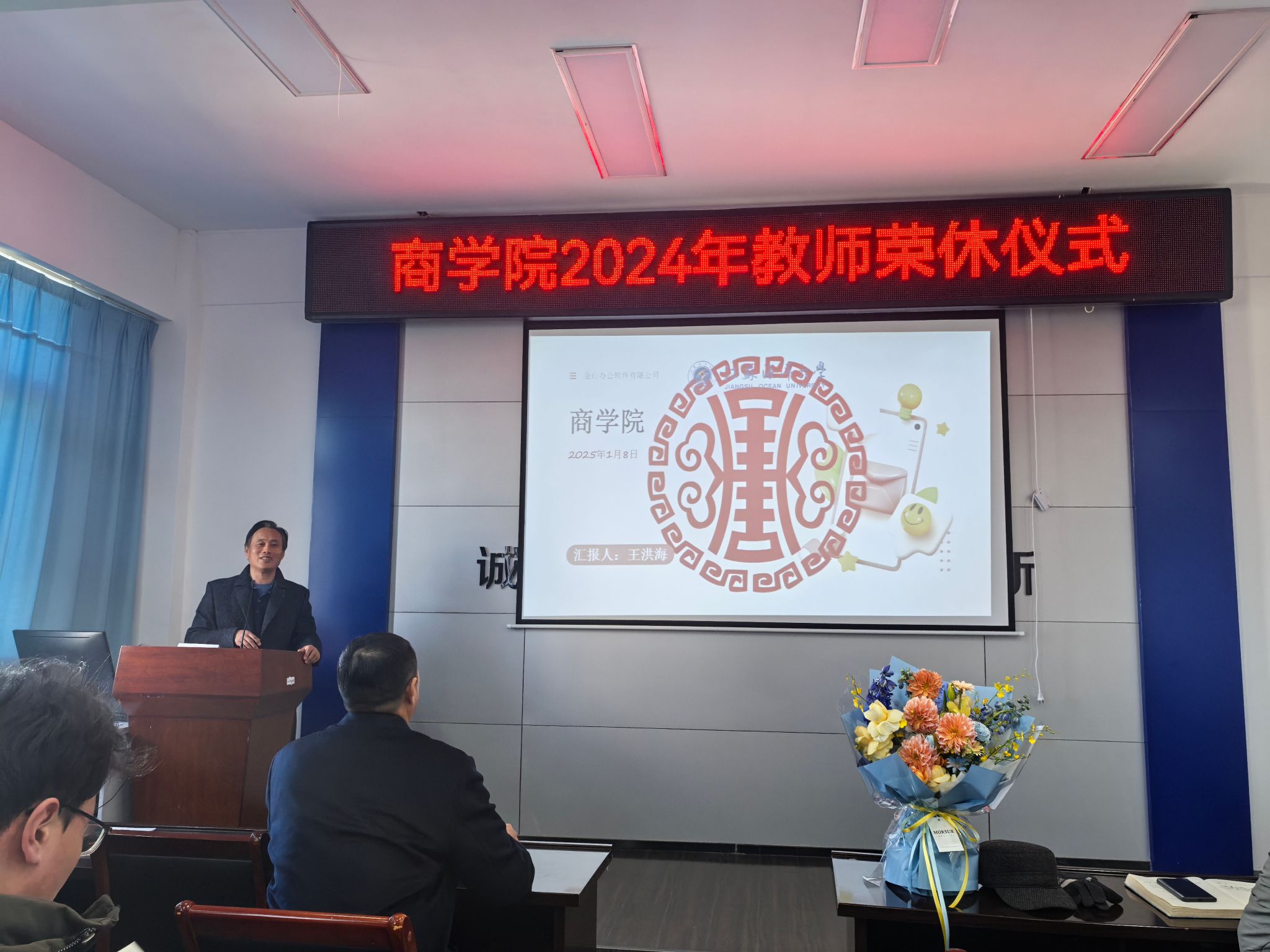 1月8日下午,威廉希尔体育全体教师汇聚一堂,为奋斗在教学一线并于2024年光荣退休的五位老教师举办荣休仪式,公司党委书记万金店主持仪式,各系年轻教师代表为退休教师献上鲜花。
