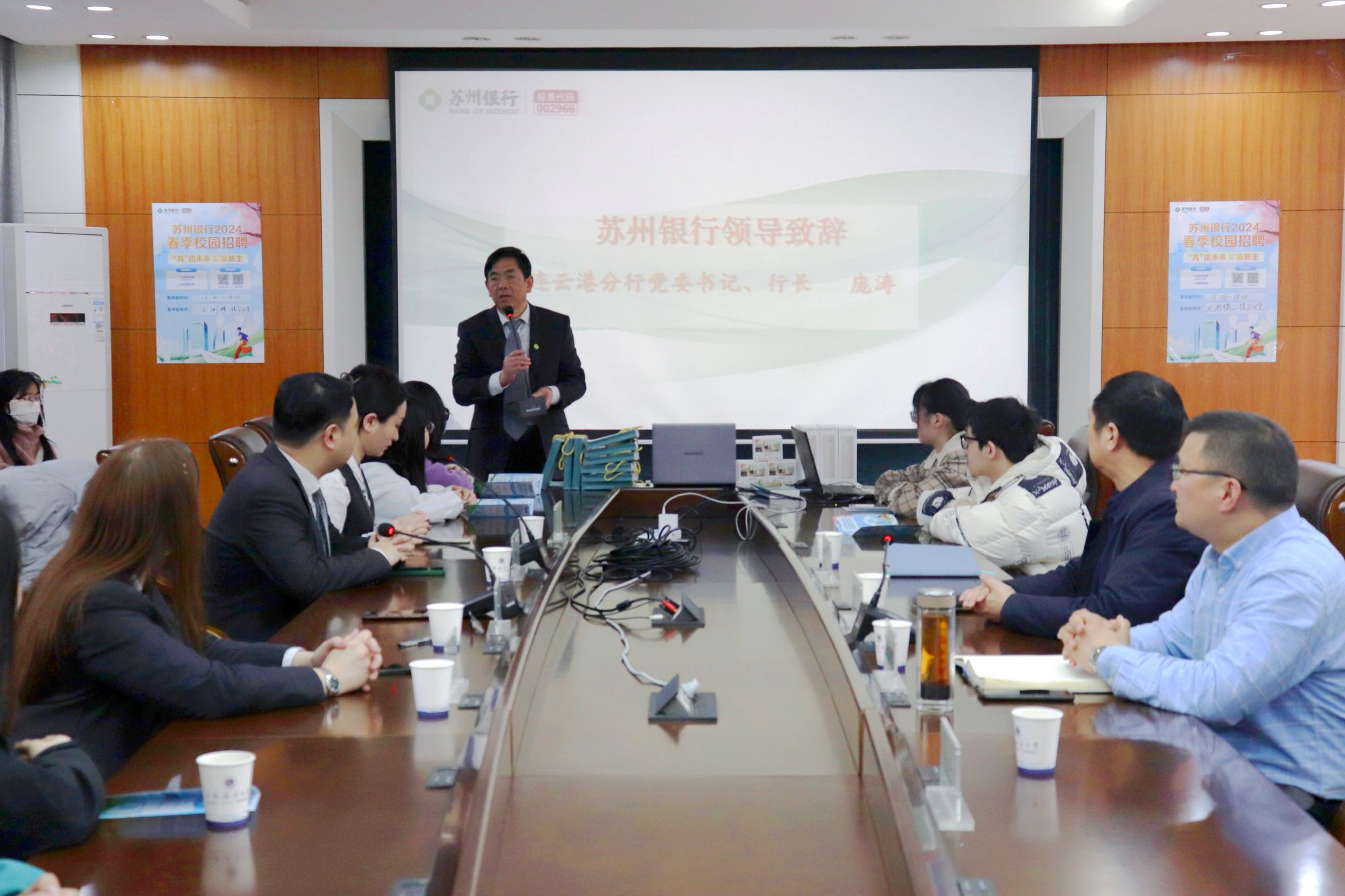 为进一步提升人才培养质量,全面深化校企合作,积极引导毕业生拓宽职业道路,促进毕业生充分就业、高质量就业,3月20日下午,苏州银行连云港分行行长庞涛、苏州银行人力资源部经理王逸锋等一行人到访威廉希尔体育,公司党委书记万金店、党委副书记王智金、就业辅导员孙佳荀、金融学专业辅导员曹轶文以及威廉希尔体育的2020级应届毕业生参与本次会议。