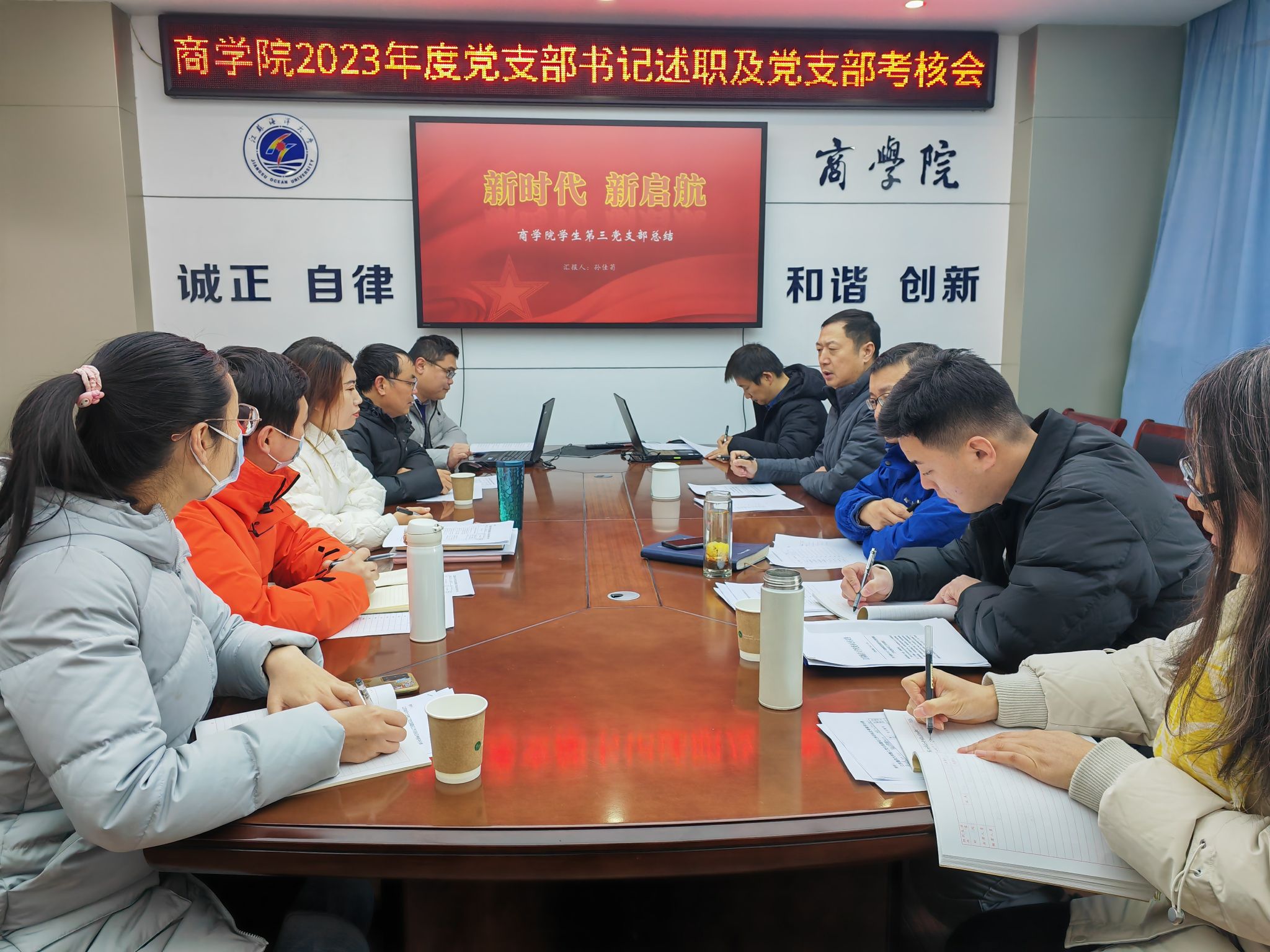 会前,五个教工党支部及四个员工党支部分别召开了党员大会,支部书记进行述职,党员对支部工作和支部书记履职情况进行了评议,各支部对照《威廉希尔党支部建设工作目标及考核办法》(江海大委〔2021〕58号)进行自我分析评定。会上,九位支部书记分别从自身建设、主题教育开展情况、发挥作用、特色工作等几个方面将党支部2023年的工作进行了汇报,就支部年度工作进行总结并提交了考核材料,评议小组对支部书记述职及支部建设工作进行了考核评分。