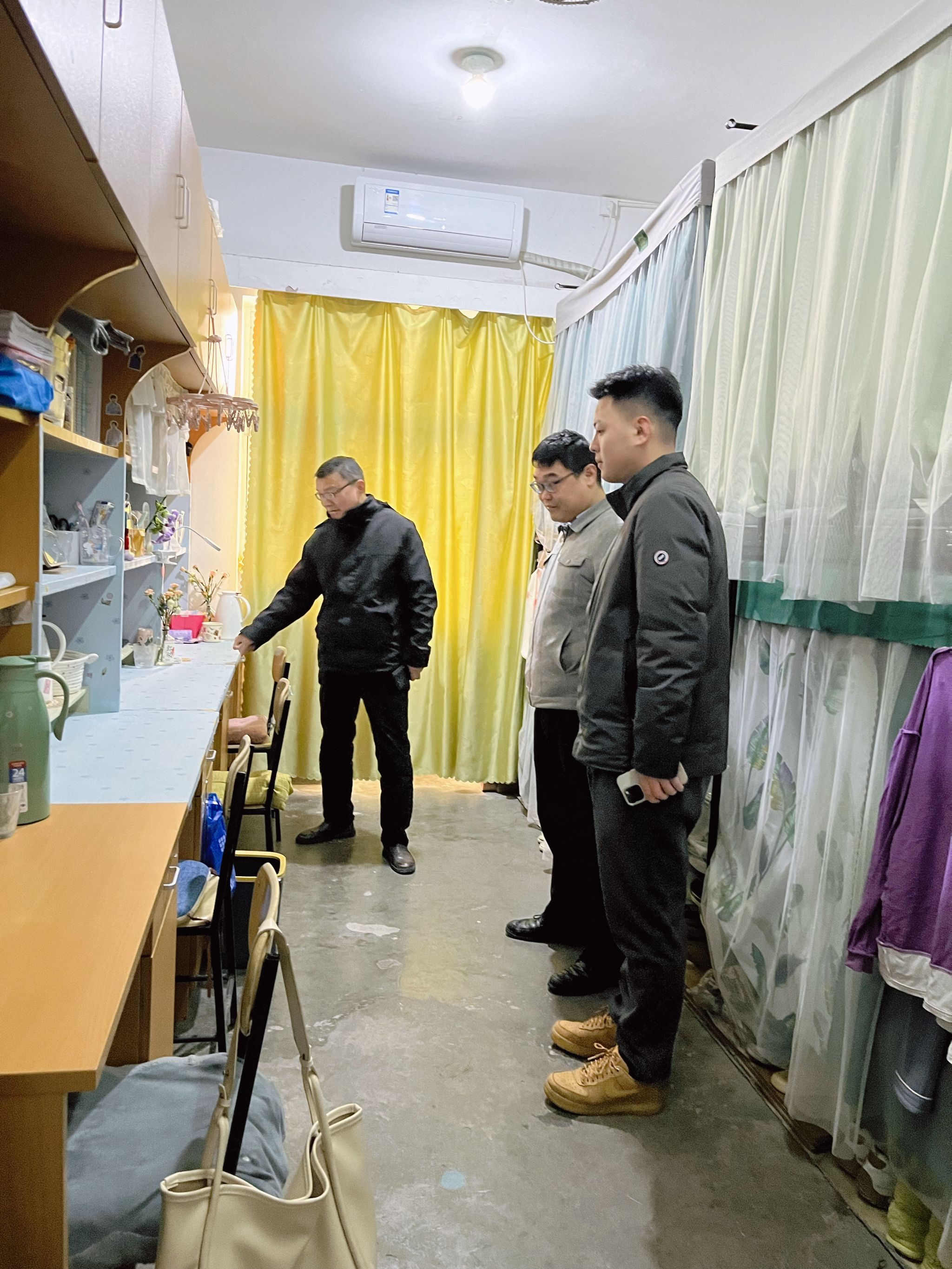 26日,公司党委副书记王智金、各班级班主任、辅导员深入员工宿舍,实地进行新学期宿舍安全检查并了解开学准备情况。在检查过程中,老师们仔细查看了员工的床铺、桌椅等使用情况,督促员工们遵守宿舍管理规定,不携带违禁品,不使用电热器具,不私拉电线,不随意贴画,不乱扔垃圾,保持宿舍的卫生和整洁。