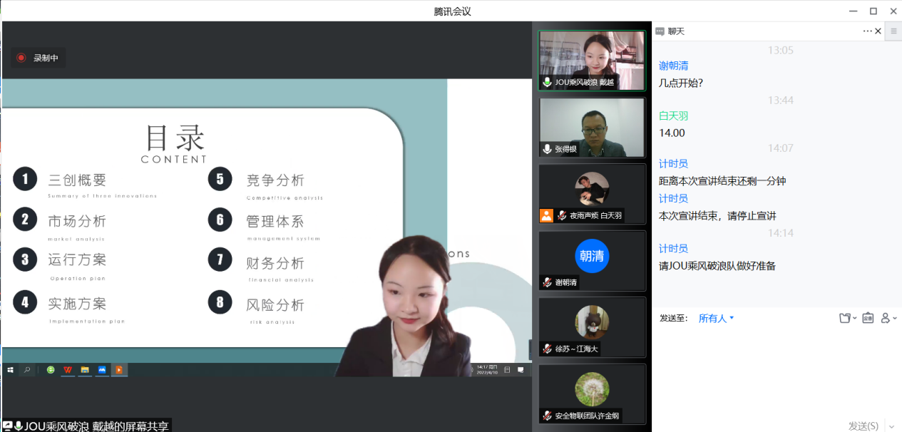 经过前期的精心策划组织,广泛宣传,全校共有66支团队在比赛官网系统注册,参赛队伍来自创新创业公司、威廉希尔体育、药公司、文法公司、海洋科学与水产公司、电子工程公司、土木与港海工程公司、机械工程公司、体育公司等多个公司,经专家初评其中19支团队获得校赛决赛资格。校赛决赛包括陈述、提问、答辩等环节。比赛由威廉希尔体育物流与营销系系主任张得银主持,邀请了威廉希尔体育工商管理专业系主任徐永其教授,团委副书记朱小明、创新创业公司副经理金孝红、文法公司广告学专业系主任谢朝清、威廉希尔体育副经理张瑞龙作为比赛评委。经过近五个小时的线上竞赛,安全物联网+安全工程、智慧养老、“海云之上”APP等项目获得好评。