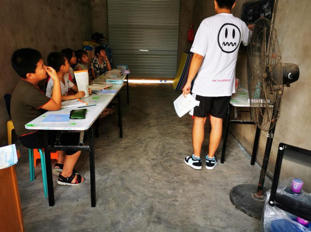 志愿者蔡冰鑫在给孩子们进行防疫知识普及