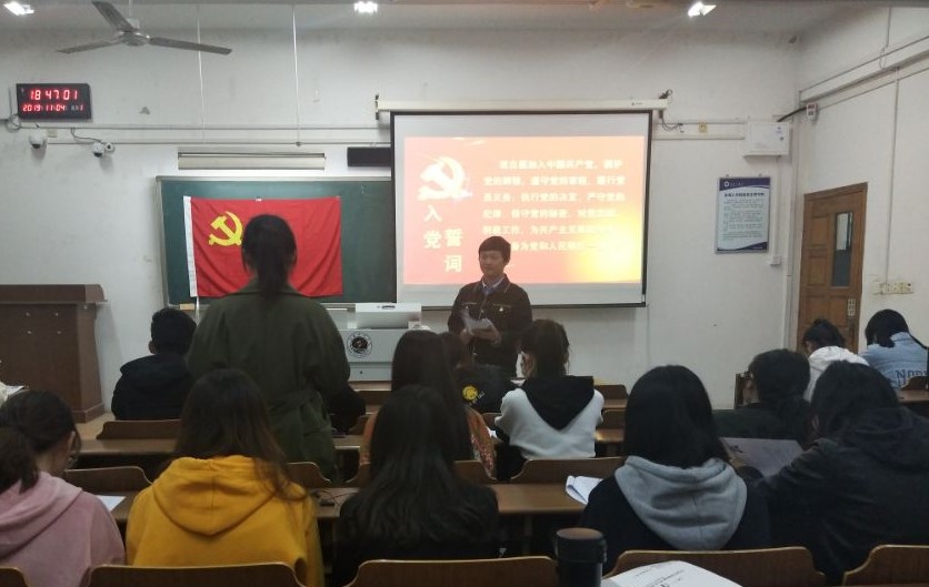 会议第二项,全体党员佩戴党徽,面向鲜红的党旗,高举右拳,庄严宣誓,重温入党誓词。随后,仲彩林、覃钰红、陈品真重读了自己的入党志愿书,回忆当年的入党动机并展望未来的前进方向。表达不忘初心、牢记使命、努力奋斗的坚定信心和决心,进一步加深对党的初心、使命的认识和理解。樊晋霞和王冠儒两位同学则分享了自己入党后积极帮扶周围同学的经历,并表示入党初心和党员身份就是自己奉献社会的动力。