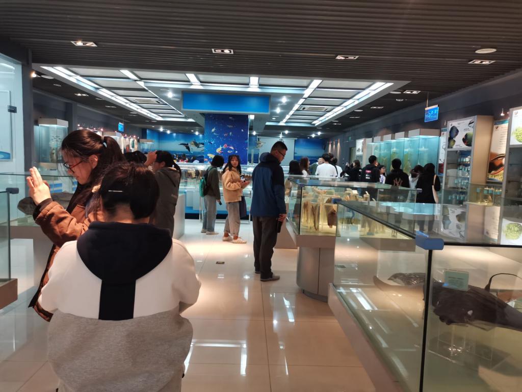 随后,在辅导员刘锦芳老师的带领下,同学们参观了威廉希尔海洋馆。海洋馆的讲解员讲述了海洋馆的馆藏历史,对馆内收藏的实物标本进行详细介绍。从甲壳类到脊椎动物展区,有身体呈铅灰色的江豚、美国著名的B-2隐形轰炸机为原型的海南牛鼻鲼、“水中大熊猫”之称的中华鲟、皱唇鲨、剑鱼等鱼类。讲解员风趣幽默地语言吸引着同学们的注意力,同学们听得津津有味。