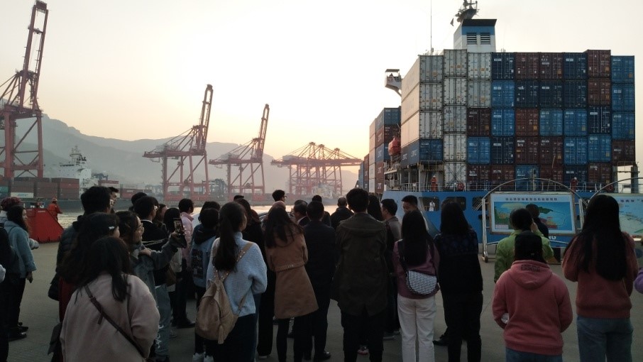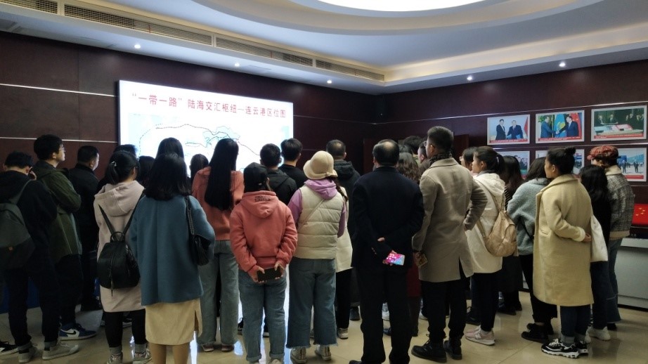 师生一行先后到爱国主义教育基地——“邓小平和人民在一起”雕塑公园、苏马湾海滨浴场、苏北第二高楼——208大厦、以专注中亚(欧)班列运输并以“港港通”而闻名的同益物流公司、繁忙的集装箱码头和一带一路第一个实体性项目——中哈(连云港)国际物流基地进行调研学习。