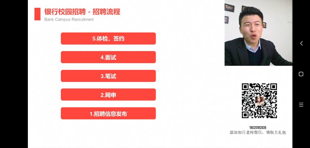 梅高翔老师专注银行笔试及面试教学工作,对银行招聘策略和考点有深入研究,成功辅导近万员工顺利与银行签约。本次培训会重点围绕招聘信息发布、网申、笔试、面试、体检和签约几个方面做了分享。梅老师用幽默、生动的语言,鲜明的案例分享、现场互动提问等多种方式,把银行考试通关经验有效的传递给了同学们。同学们均感到受益匪浅。