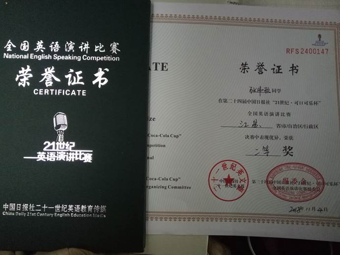 公司学子喜获第二十四届中国日报社"21世纪·可口可乐杯"全国英语演讲比赛江苏赛区决赛二等奖