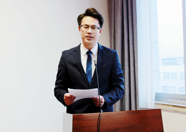 江苏德源药业股份有限公司副总经理杨汉跃先生在致辞中介绍了德源药业股份有限公司的基本情况、企业文化、企业的社会责任,以及设立奖学金的目的,他表达了对获奖同学的祝贺和期望,欢迎更多淮海工公司的毕业生能够选择德源药业。