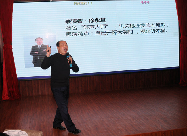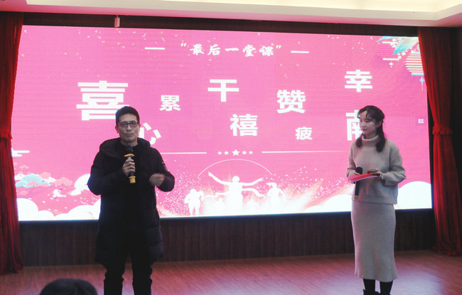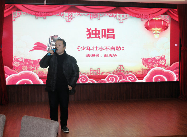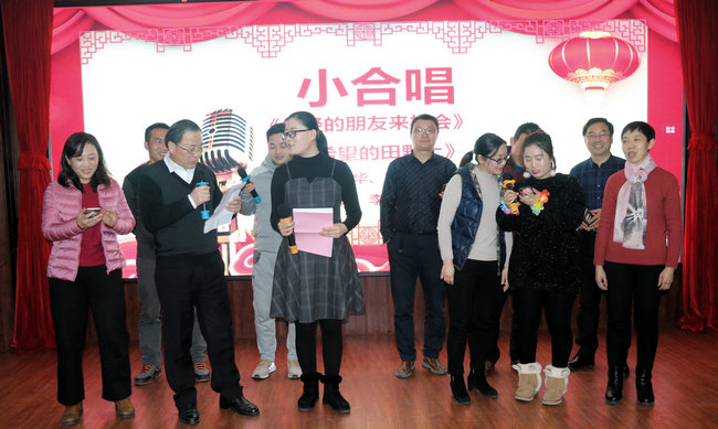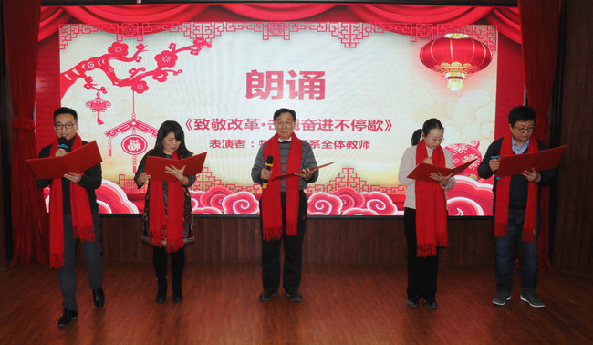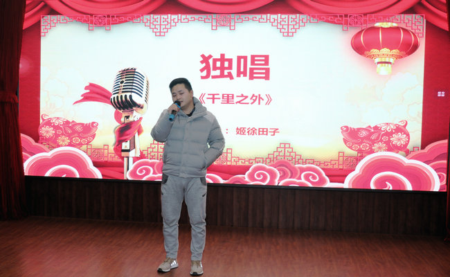 接着,围绕“致敬改革路,砥砺谋新篇”主题,老师们带来了精彩纷呈的节目:由公司党政领导带领综合办、学工办演唱了《年轻的朋友来相会》、《在希望的田野上》两首歌曲,重温了改革开放初露峥嵘时每一位中国人心中的激荡;何华安、翟仁祥、谭鑫等几位老师演绎了《海草舞》,借海草传递正能量,海洋的壮丽景色离不开每一棵海草,而公司的每一处成绩取得都离不开奋力拼搏的商院人;姬徐田子老师独唱《千里之外》,展望了公司在新的一年里秉持院训,必将发挥优势坚持高质发展,奋力实现“两建一高”的阶段目标,披荆斩棘,让改革光辉照耀千里之外。徐永其老师自编自演的脱口秀《乐在“其”中》将晚会推向一个高潮,引经据典,亦庄亦谐,生动地展现了大学教育的真实场景,流露出一代老教师的真性情;物流管理系老师朗诵的《致敬改革·击楫奋进不停歇》歌颂了伟大祖国,也讲述了公司老中青三代教职工在淮海园踏实奋进、追求梦想的故事;商思争老师演唱歌曲《少年壮志不言愁》,点燃了大家心中不惧不灭的坚毅豪情,表达了公司教师在各项工作上的任劳任怨与艰苦执着的精神。最后,在场教职工合唱《难忘今宵》,大屏幕缓缓呈现近年来公司活动掠影与集体照,唤起全场追忆往昔,将现场气氛推向最高潮。