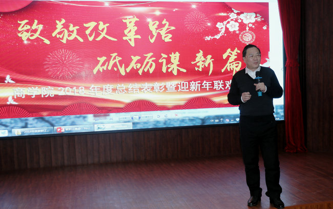 威廉希尔体育经理宣昌勇首先致辞,他说“过去的2018年对于每一个中国人来说都是神圣而独特的;过去的2018年对于每一位商院人来说也是深刻而难忘的,全院老师共同努力创造了新的奇迹——我们的科研到账经费达到680万元,为威廉希尔的创建做出了新的贡献。2019年是创建威廉希尔的决战之年,在新的一年里,每一位老师都要拥有坚不可摧的信念和投身建设的洋溢热情,做敢为人先的追梦人,千帆扬,驰骋万重浪。”