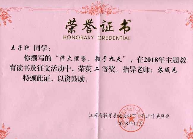 2018年是中国改革开放四十周年。改革开放是中国当代重大的历史转折,在中国共产党领导下,四十年来,中国社会发生了翻天覆地的巨大变化。党和国家的工作重心转移到经济建设上来,经济腾飞,综合国力急剧增强,人民生活水准飞速提高,中华民族努力实现民族伟大复兴的中国梦。青少年员工是祖国的未来,是伟大复兴的希望,为了将庆祝改革开放同青少年德育教育有效结合,省教育系统关工委开展了《2018年主题教育活动》----“伟大的复兴之路”主题征文活动。公司关工委在全校范围内精心组织了征文活动,遴选出了优秀稿件参加省教育部关工委征文比赛。经专家评审委员会评议,王子轩同学《淬火涅槃,翱于九天》获得征文活动二等奖。