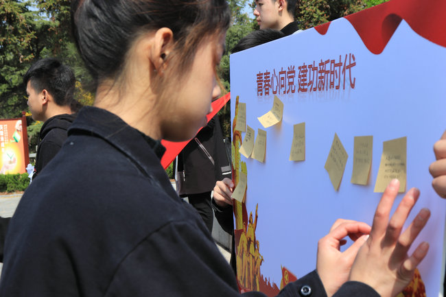 团员代表顾世琦同学在团旗下发言,他从坚定理想信念、勇于开拓创新、牢记历史使命三个方面,号召团员们加倍努力,励志勤学、刻苦磨砺,在实现中华民族伟大复兴的历史征程上谱写出更加辉煌的青春乐章。最后大家高举右拳,面向鲜红的团旗,重温入团誓词,激昂的宣誓声久久回荡,振奋人心。全体团员纷纷在宣传展板上贴上自己的留言便利贴,诉说自己对团组织的祝福、对未来的期许、自己的感悟和奋斗目标。