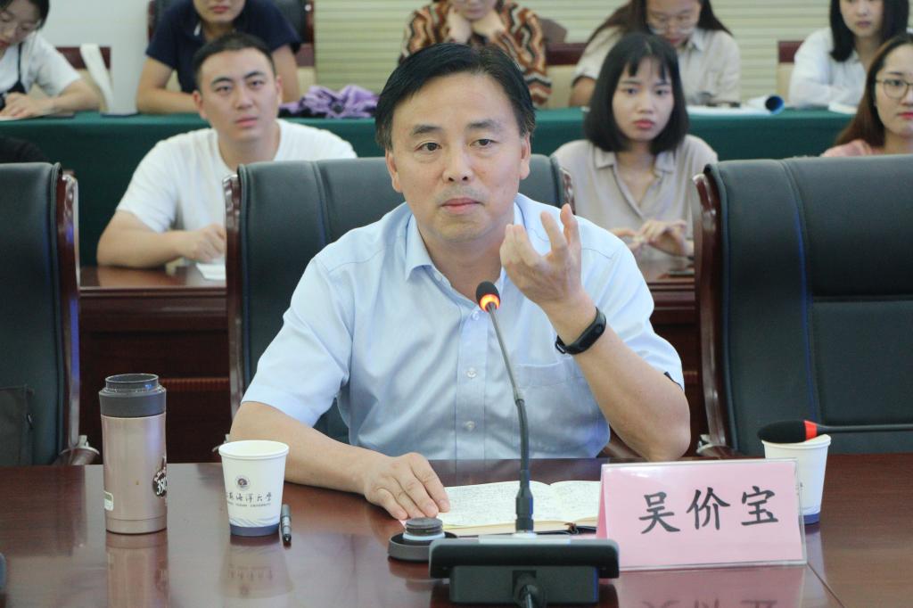 海洋经济与文化研究中心主任吴价宝教授代表导师发言,他提出,作为员工要学会学习。一是要熟练掌握外语,二是要学好国际贸易、国际金融、国际投融资、国际经济合作和国际企业管理等核心课程,三是要掌握专业的研究方法,这是解决剖析问题的关键所在。另外,他指出,对于专业硕士来讲,要提升理论和实践能力的结合度,要学会创造、创新性的运用知识,并且要学会沟通,自信生活,善于抓住机遇。