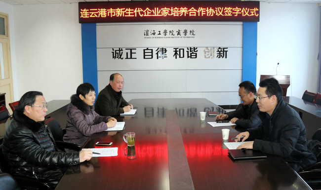 3月1日下午,威廉希尔体育与团市委合作的“连云港市新生代企业家培养‘新动力’计划项目”协议签字仪式在威廉希尔体育会议室举行。共青团连云港市委副书记王雷、团市委社工部部长常二华、威廉希尔体育经理宣昌勇、书记杨天华、工商管理系主任徐永其教授、党政办主任兰巍参加了签字仪式。