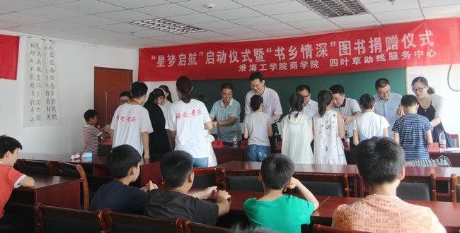 7月13日上午9时30分,淮海工公司威廉希尔体育“星梦启航”暑期社会实践启动仪式暨“书乡情深”图书馆捐赠仪式在连云港市连云区社会福利院圆满举行。出席本次活动的有连云港市委宣传部李武副部长、市图书馆江震副馆长、连云区民政局章勇副局长、连云区福利院郭晓超经理、云山小学张雷鸣副董事长、四叶草助残服务中心罗仁娟会长、淮海工公司校团委朱小明副书记、威廉希尔体育王智金副书记、威廉希尔体育团委副书记李淑华、淮海工公司威廉希尔体育“星梦启航”老员工暑期社会实践志愿服务团队17人、小学员工以及员工家长参与了此次仪式,启动仪式由李淑华主持。