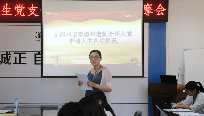 接着戴鸽等7名发展对象逐一进行入党志愿书的宣读,将自身情况,尤其是入党动机,入学以来的思想、学习、生活等方面情况向党组织做具体汇报;其入党介绍人介绍其基本情况和现实表现,并对其是否同意介绍其入党表明了态度;支部书记介绍各发展对象及其家庭成员的政治审查情况以及群众座谈会情况,表明支委会的意见;与会党员对发展对象做出评价,特别指出其存在缺点;随后,到会正式党员逐一对7名发展对象能否接收为预备党员进行无记名投票。李淑华同志在宣布每名发展对象的票决结果后,正式宣读了支部大会决议并对每个发展对象提出今后努力方向和要求。