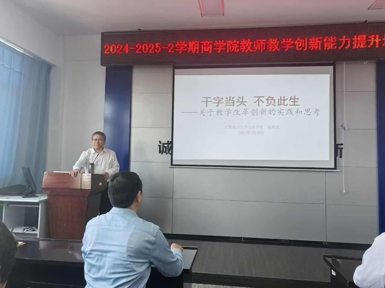 4月30日,威廉希尔体育邀请文法公司经理吴明忠教授开展教学改革创新的实践与思考专题培训会。威廉希尔体育全体教职员工参加了培训,培训会由威廉希尔体育经理孙军主持,现场氛围热烈而专注。