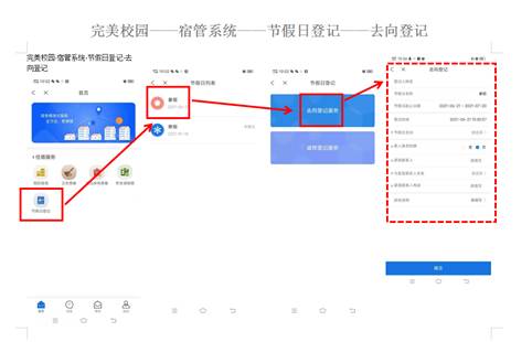 (1)离校返家申请。打开完美校园, “节假日登记”-“暑假”-“去向登记服务”,按照要求填写相关信息。