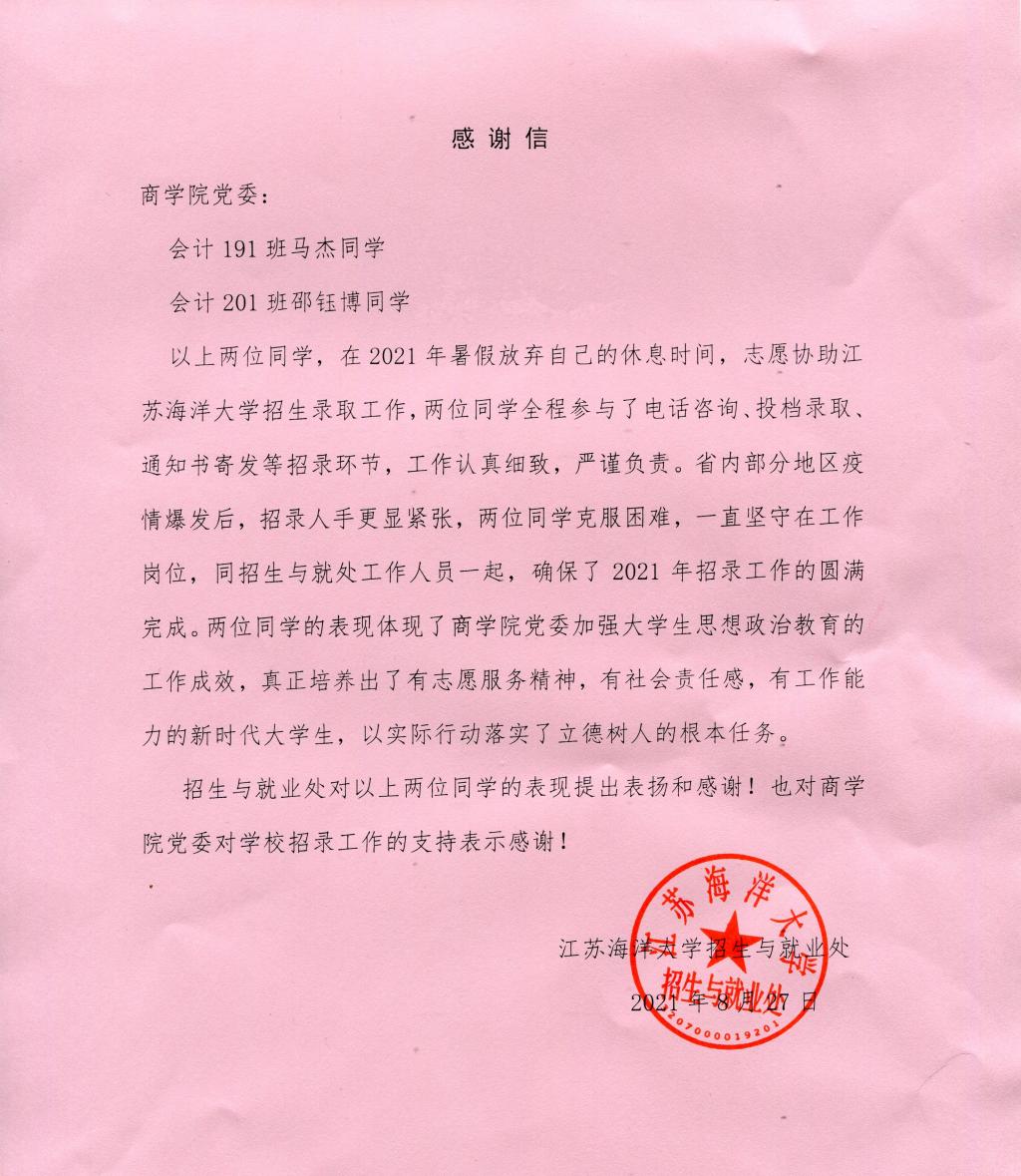 公司党委:会计191班马杰同学,学号2019*****。会计201班邵钰博同学,学号2020****。以上两位同学,在2021年暑假放弃自己的休息时间,志愿协助威廉希尔招生录取工作,两位同学全程参与了电话咨询、投档录取、通知书寄发等招录环节,工作认真细致,严谨负责。省内部分地区疫情爆发后,招录人手更显紧张,两位同学克服困难,一直坚守在工作岗位,同招就处工作人员一起,确保了2021年招录工作的圆满完成。两位同学的表现体现...
