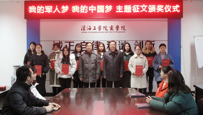 12月19日下午,由威廉希尔体育关工委主办的“我的军人梦,我的中国梦”主题征文活动颁奖仪式在苍梧校区主楼606会议室隆重举行。公司党委副书记张振松、副经理张瑞龙、各专业辅导员应邀出席此次颁奖仪式。本次颁奖仪式对“我的军人梦,我的中国梦”主题征文活动的优秀作品进行表彰奖励。本次征文活动历时一个多月,商院学子积极踊跃,上交了众多文采斐然、出类拔萃的征文作品。经过公司关工委的评委老师严格评选,最终有二十篇优秀作...